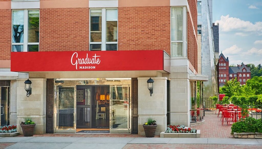 The Graduate Madison is located in the heart of downtown Madison on the University of Wisconsin campus, steps from State Street dining and shopping. As a guest of the Graduate, you are invited to enjoy all of the following services and amenities: Portage Pi, coffee & juice bar with hand pies and healthy eats, Camp Trippalindee, rooftop bar with sweeping views of the Capitol and Lake Mendota, 24 hour fitness center, complimentary shuttle service.