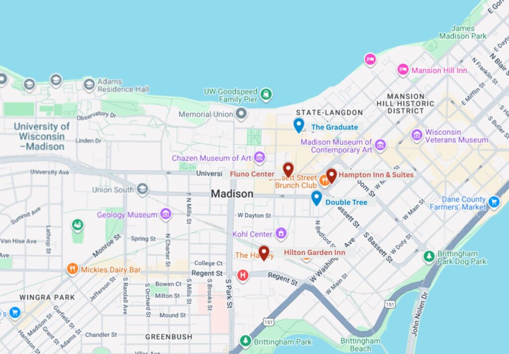 The Doubletree Hotel Madison is in the heart of downtown Madison, Wisconsin, at the eastern edge of the University of Wisconsin campus and is nestled between the Lakes Monona and Mendota, and is within walking distance of the State Capitol, the UW Badgers’ Kohl Center, Camp Randall Stadium, and the eclectic State Street shopping and entertainment district. The Doubletree Hotel is about 10 minutes walking distance from the site.